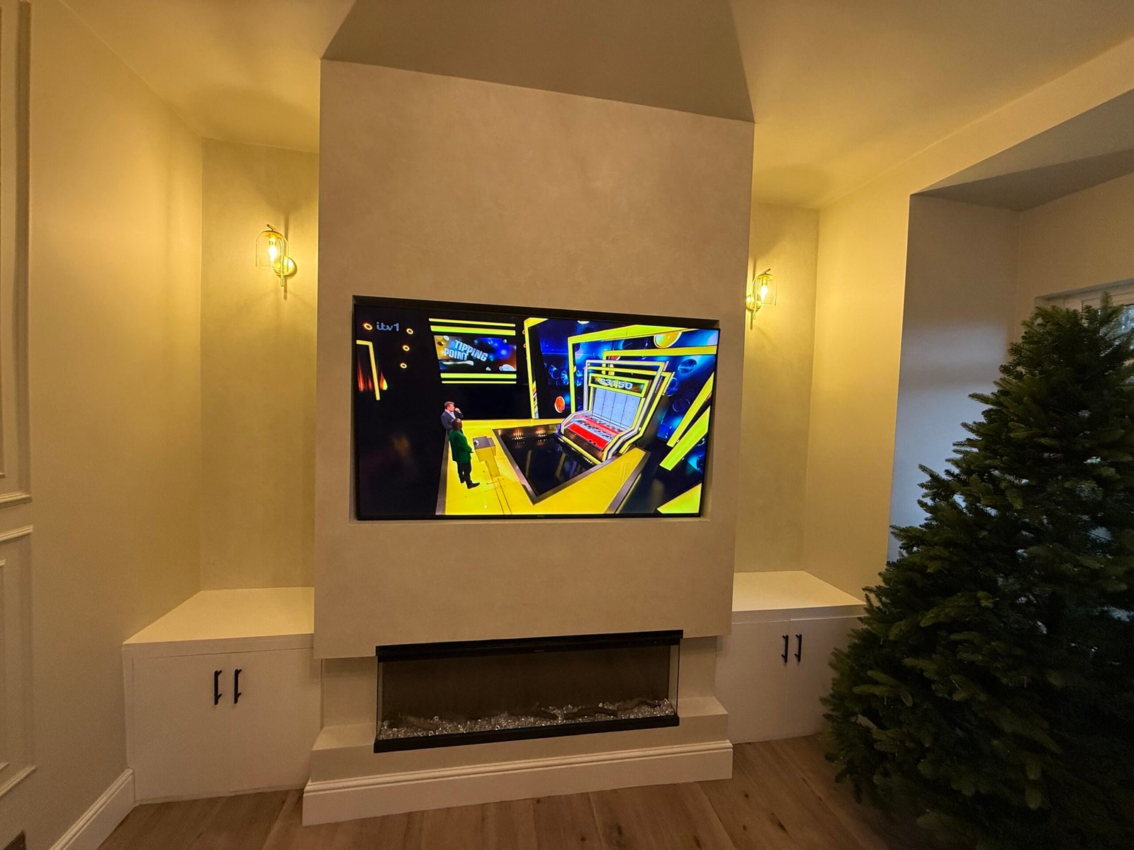 We can create a simple feature wall or a full media setup with storage and integrated details, finished neatly