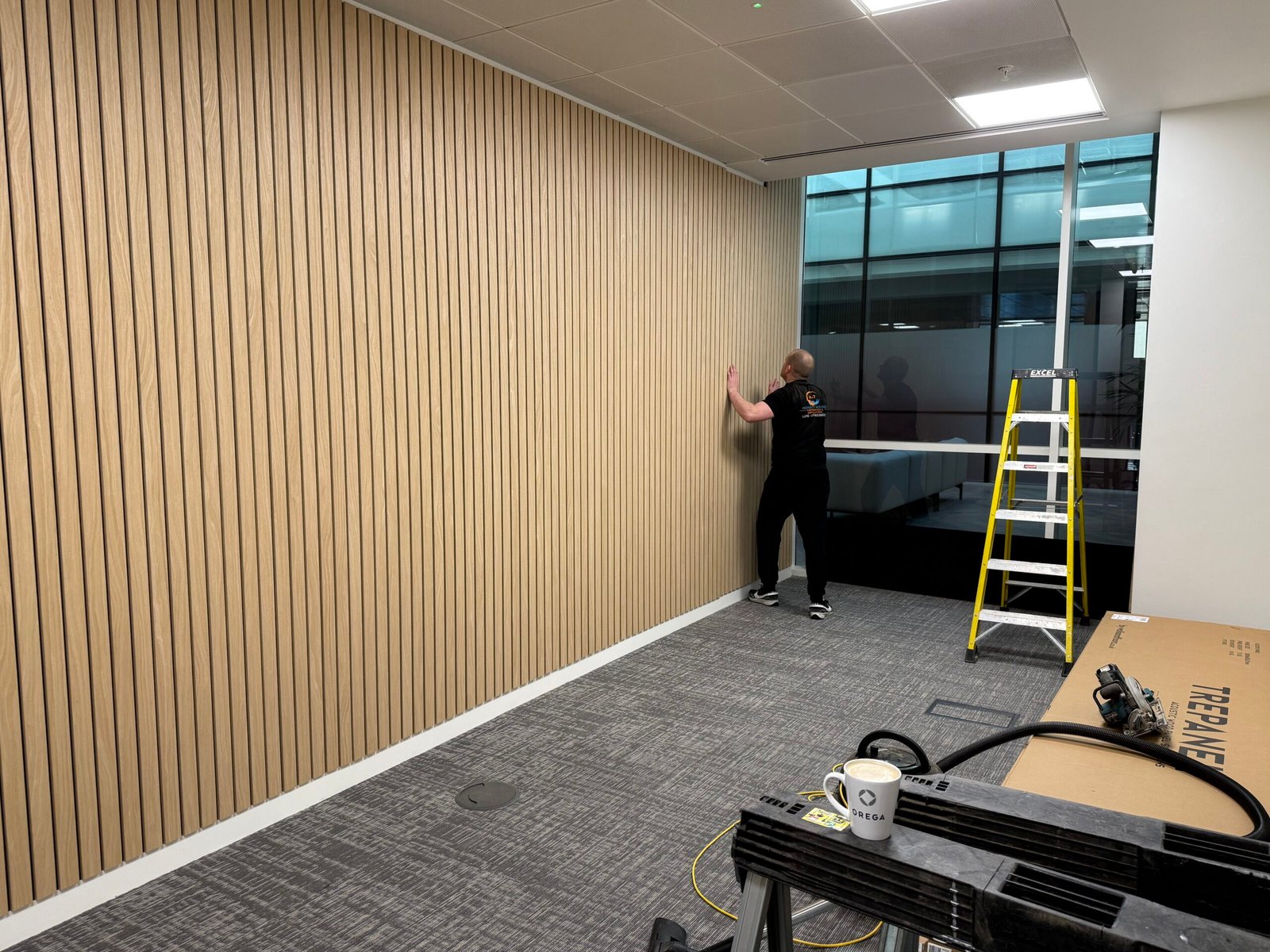 We construct and install the media wall or panelling with accurate fixing, straight lines, and tidy joints.